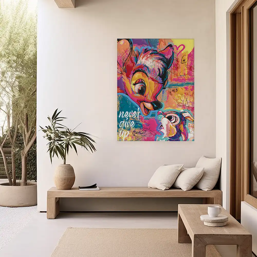 Mit der modernen, matt wirkenden Leinwandstruktur erhält dein Bild eine wertige Galerie-Optik. Hänge Malen nach Zahlen - Bambi - Never Give Up gut sichtbar auf – als farblichen Akzent im Wohnzimmer, als persönliches Statement im Arbeitszimmer oder als Geschenk, das lange Freude macht.