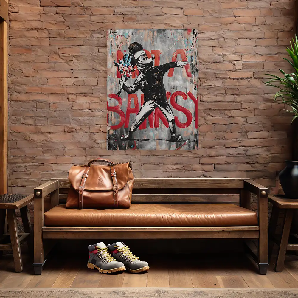Das Bild zeigt eine geheimnisvolle Figur in schwarzer Kleidung und Hut. Über das Gesicht ist ein Tuch gebunden, während die Figur dynamisch einen Blumenstrauß in die Luft wirft. Im Hintergrund ist der Schriftzug "Banksy" in auffälligen roten Buchstaben zu sehen, der die rebellische Stimmung des Kunstwerks unterstreicht. Die Farbpalette, bestehend aus Schwarz, Rot, Weiß, Grau und Blau, verstärkt die kraftvolle Ausdruckskraft des Motivs.
