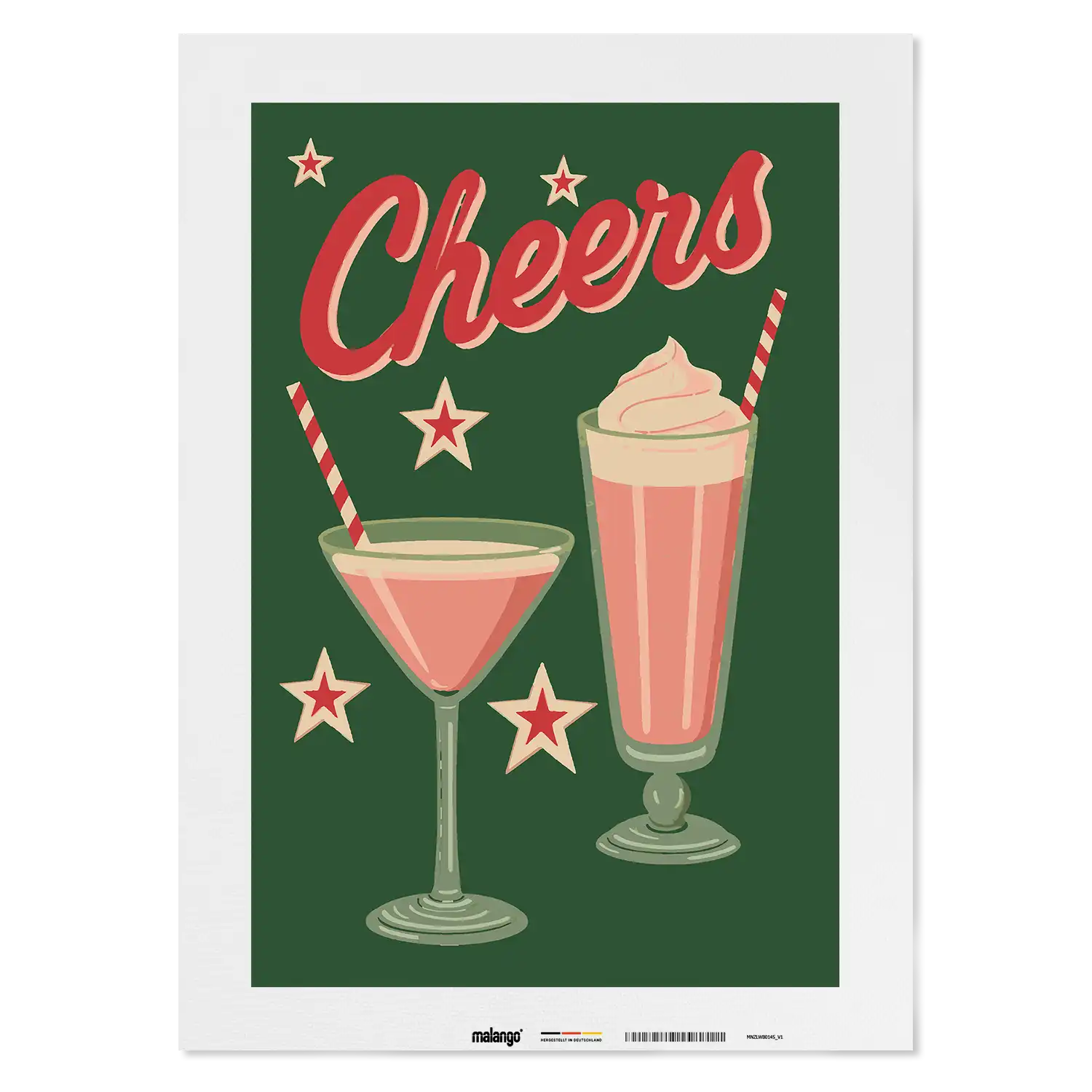 Das Malen-nach-Zahlen-Motiv Cheerful Christmas von malango.de bringt die festliche Jahreszeit mit einem augenzwinkernden, fröhlichen Design zum Leben. Auf einem tiefgrünen Hintergrund leuchten zwei weihnachtlich inspirierte Drinks in warmen Rosé- und Cremefarben, begleitet von kleinen Sternen, die dem Motiv seinen charmanten Retro-Touch verleihen. Darüber schwebt der Schriftzug „Cheers“ in festlichem Rot – ein ausdrucksstarkes Statement, das perfekt zur Weihnachtszeit passt und gleichzeitig ein Gefühl von Feierlichkeit und Unbeschwertheit vermittelt.