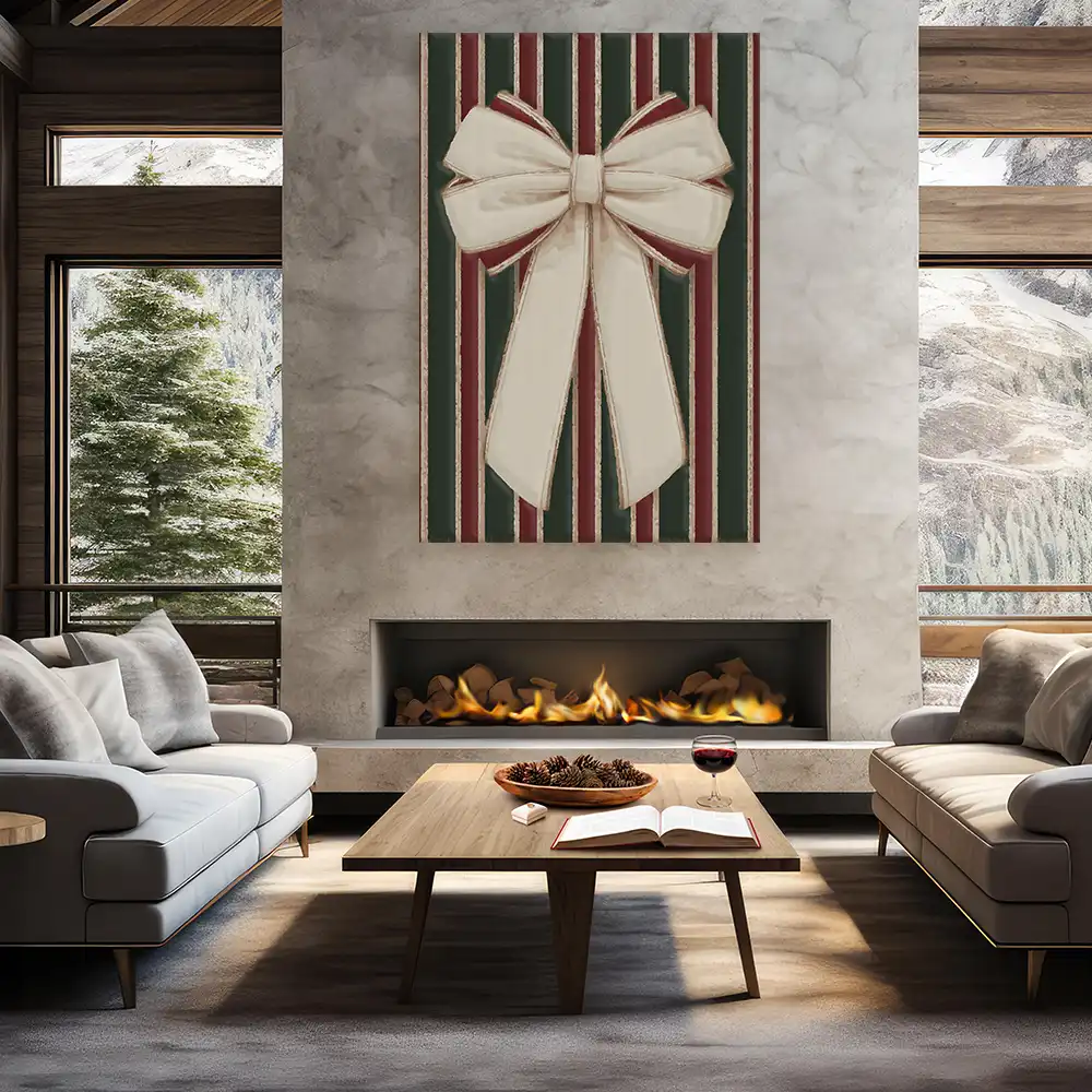 Eine Schleife ist weit mehr als ein dekoratives Element. Sie steht für Verbundenheit, Zusammenhalt und Freude – genau jene Werte, die zur Weihnachtszeit so bedeutungsvoll sind. Dieses Motiv verkörpert diese festliche Stimmung auf eine Weise, die sowohl zeitlos als auch modern wirkt. Während die elegante Struktur der Schleife Wärme und Gemütlichkeit ausstrahlt, sorgt der dunkle Hintergrund für Tiefe und Ruhe. Der Kontrast zwischen den sanften Cremetönen und den Farbstreifen in Grün und Rot verbindet zwei Welten: die zarte Anmut und die traditionelle Festlichkeit.