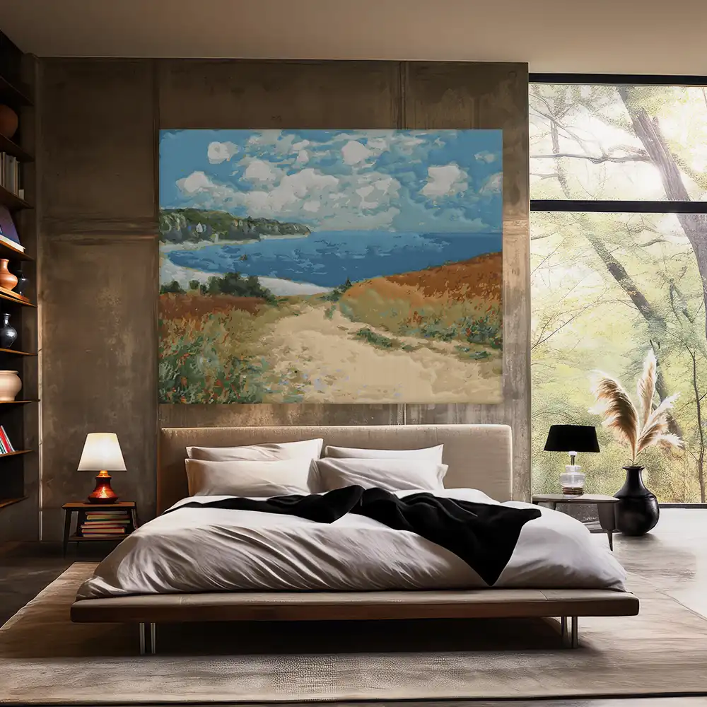 Erlebe die ruhige und friedliche Atmosphäre eines impressionistischen Kunstwerks mit dem Wandbild "Strandweg zwischen Weizenfeldern bei Pourville". Dieses Bild zeigt eine malerische Landschaft, die dich auf eine visuelle Reise entlang eines idyllischen Weges führt, der sich durch weite Wiesen bis hin zu einem blauen Meer erstreckt. Im Hintergrund zeichnen sich sanfte Hügel und eine Küstenlinie ab, die von einem teils bewölkten Himmel überragt werden.