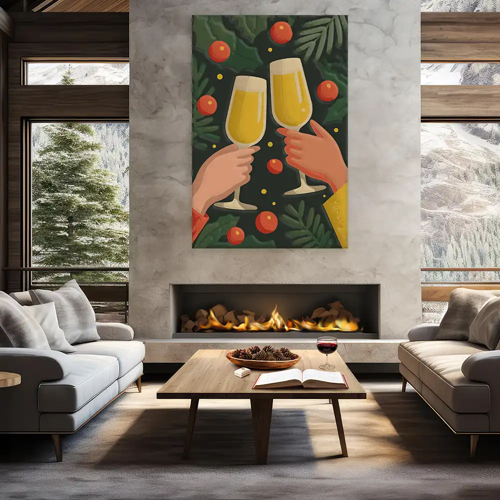 Die Symbolik des Anstoßens ist universell und herzlich. Gleichzeitig bringt die Gestaltung Tiefe und Festlichkeit ins Bild. Es ist ein Motiv, das sowohl dekorativ als auch emotional wirkt – ein Kunstwerk, das Räume belebt und Menschen berührt.
