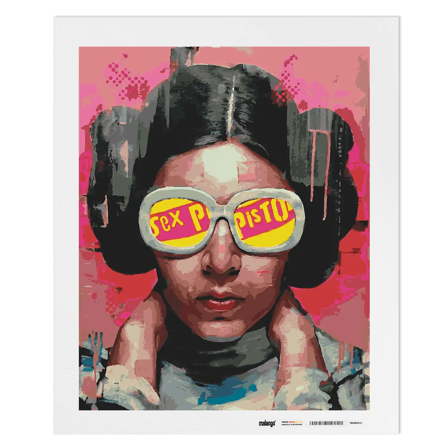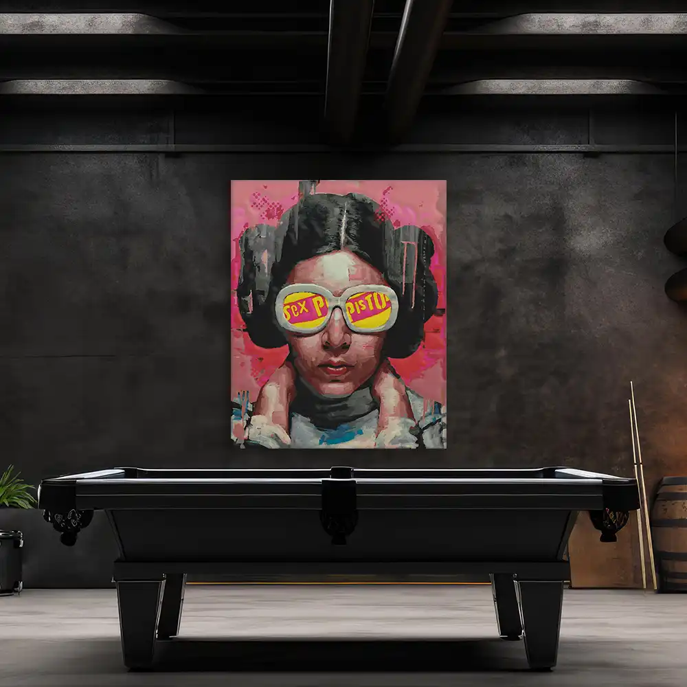 Entdecke das ausdrucksstarke Kunstwerk "Leia Pistols", das eine rebellische Stimmung direkt in dein Wohnzimmer bringt. Dieses Werk im Pop-Art-Stil zeigt eine Person mit einem stilisierten Gesicht, die eine große Sonnenbrille trägt. In den Gläsern der Brille sind die Worte "Sex Pistols" prominent zu sehen, was dem Bild eine provokante und zugleich faszinierende Note verleiht.