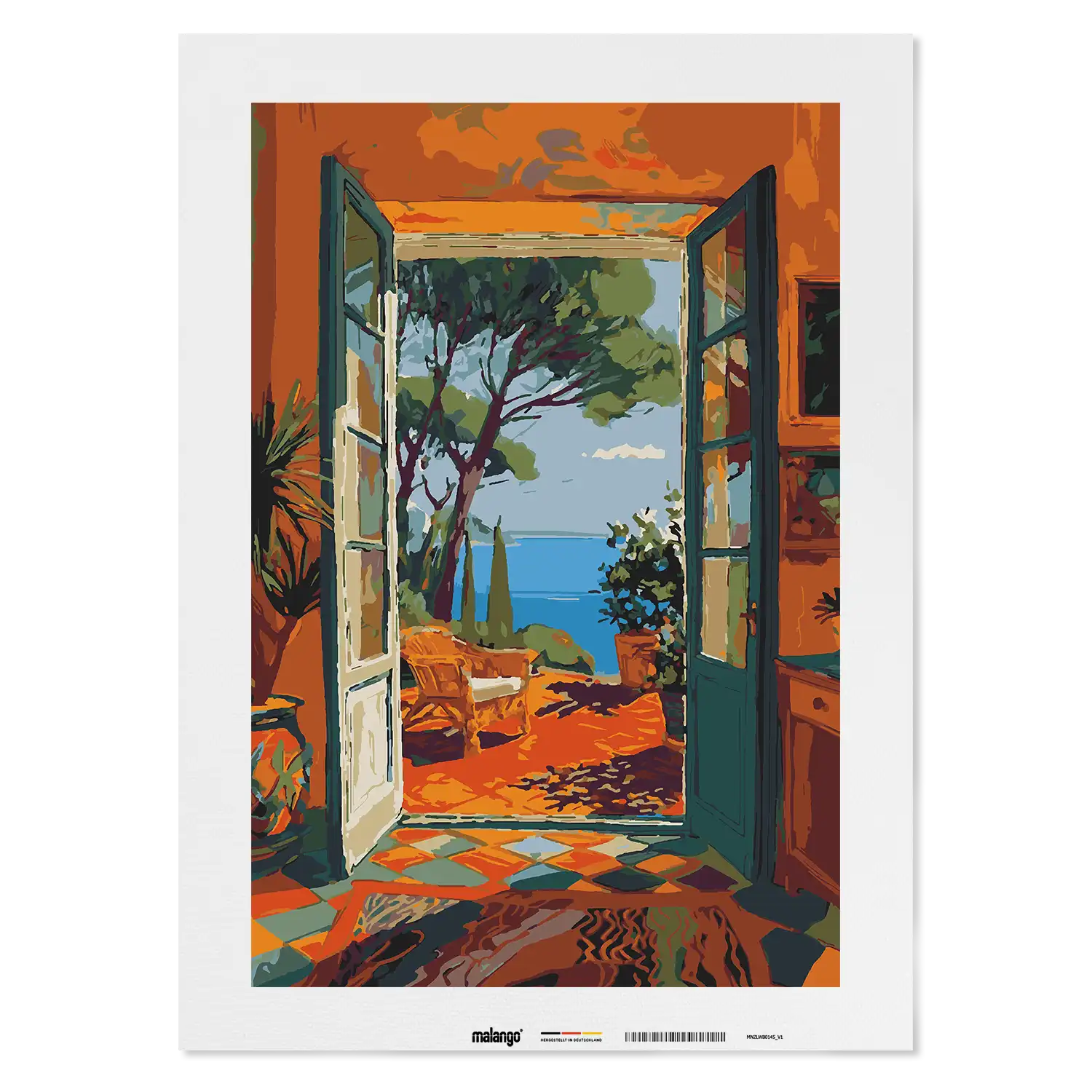 Erlebe die friedliche Atmosphäre und die einladende Stimmung des Sommerblicks über die Bucht von Menton. Dieses moderne Kunstwerk fängt die Essenz eines warmen Sommertages perfekt ein, indem es eine offene Tür zu einer Terrasse mit einem atemberaubenden Blick auf das Meer zeigt. Die Komposition aus lebhaften Farben wie Orange, Blau, Grün, Braun und Weiß vermittelt ein Gefühl von Ruhe und Gelassenheit.