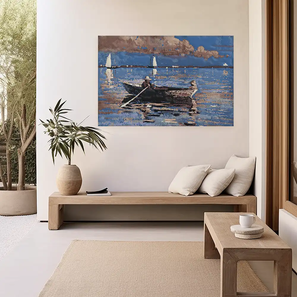 Erlebe die ruhige und entspannte Atmosphäre des impressionistischen Kunstwerks "Gloucester Harbor". Dieses Wandbild zeigt eine friedliche Szene auf einem See, die durch die weichen Pinselstriche des Impressionismus zum Leben erweckt wird. Im Vordergrund siehst du ein Ruderboot mit zwei Personen, während sich im Hintergrund Segelboote über das Wasser bewegen und eine dramatische Wolkenformation den Himmel ziert. Die Farbpalette aus Blau, Braun, Weiß, Schwarz und Grau unterstreicht die friedliche Stimmung dieser malerischen Szene.